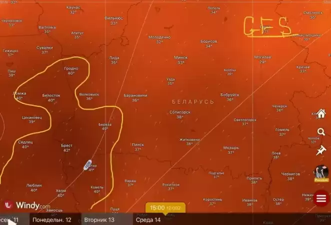 В Березе, согласно этой модели, во вторник, 13 августа, будет +40°, в Минске +33°, в Молодечно +32°, в Могилеве +29°.