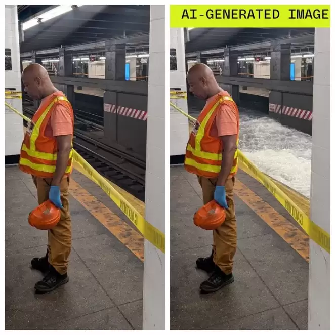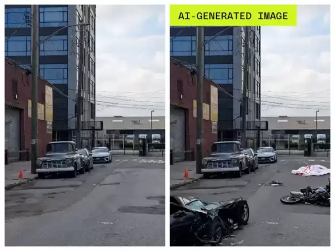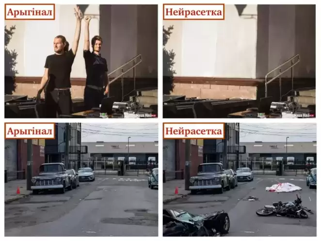 Примеры работы нового искусственного интеллекта от Google под названием Reimagine (Переосмысли): первое сравнение показывает, как в один клик с известной фотографии можно убрать культовых «Диджеев перемен», а второе сравнение — как мгновенно сделать ДТП со смертельным исходом там, где его никогда не было. Фото: «Наша Ніва», Cath Virginia / The Verge
