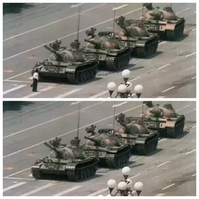Вверху всемирно известный оригинальный снимок выхода китайского протестующего навстречу танкам, ехавшим подавлять студенческие протесты (события происходили 4 июня 1989-го), а внизу искусственно отредактированный вариант фото, на котором никакого смелого протестующего не существует, что сделано в один клик благодаря Reimagine. Фото: Wikimedia Commons