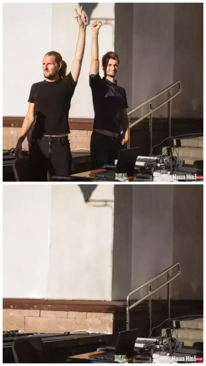 Второй пример — культовое фото «Диджеев перемен», сделанное в разгар президентских выборов в Беларуси в августе 2020-го. В один клик искусственный интеллект от Google сумел полностью убрать и их, но все же оставил несколько мелких артефактов, если присмотреться.