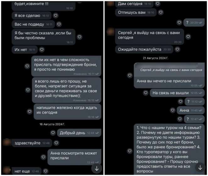 Потом Дарья сама созвонилась с Анной и попросила сбросить бронь в подтверждение того, что все хорошо, однако та ничего не прислала. В соцсетях Дарья получила сообщения от мужчины, что он купил тур и не смог улететь. Это насторожило девушку, но у Анны было свое объяснение: с этим клиентом случился форс-мажор, поэтому он начал писать ее подписчикам в соцсетях.