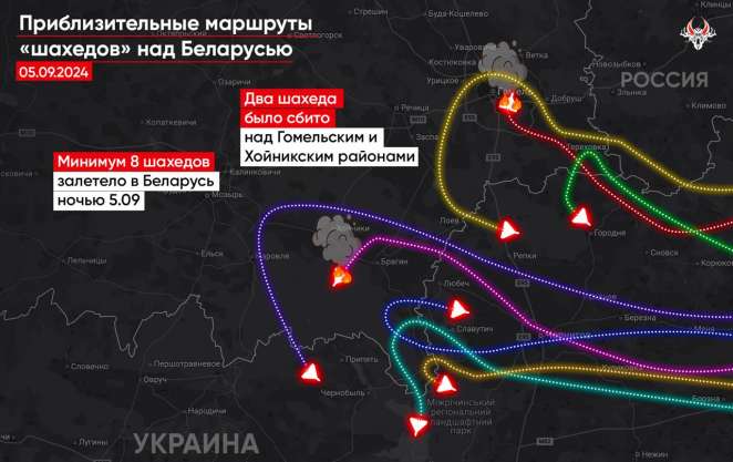 Маршруты беспилотников, вторгшихся в воздушное пространство Беларуси в ночь на 5 сентября. Изображение: «Беларускі Гаюн»