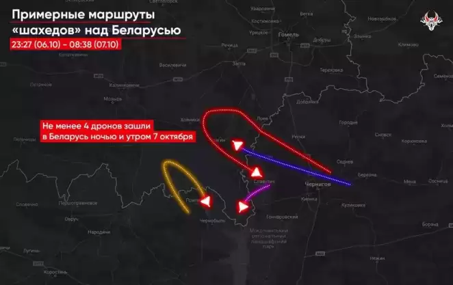Далее шахеды заходили в Беларусь в 00:40, 04:06 и 08:35. Известно, что дрон, который залетел в Беларусь в районе Лоева в 04:06, покрутился в воздушном пространстве Беларуси около 40 минут и вернулся обратно в Украину.