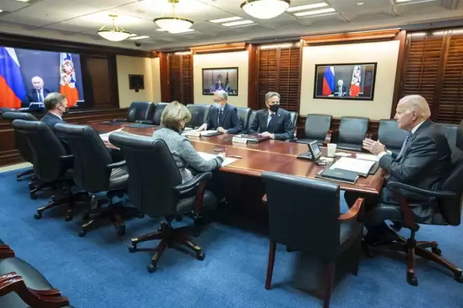Джо Байден в присутствии его команды разговаривает с Владимиром Путиным по видеосвязи, когда тот находится в ковидной изоляции в бункере под Москвой, 7 декабря 2021 года. Фото: Adam Schultz / The White House via AP