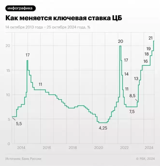Именно для того, чтобы не допускать перегрева экономики и разгона инфляции, происходит уже третье за год повышение ключевой ставки. В июле ее подняли с 16 до 18% годовых, а в сентябре — до 19%. Текущее повышение до 21% стало рекордным для России.