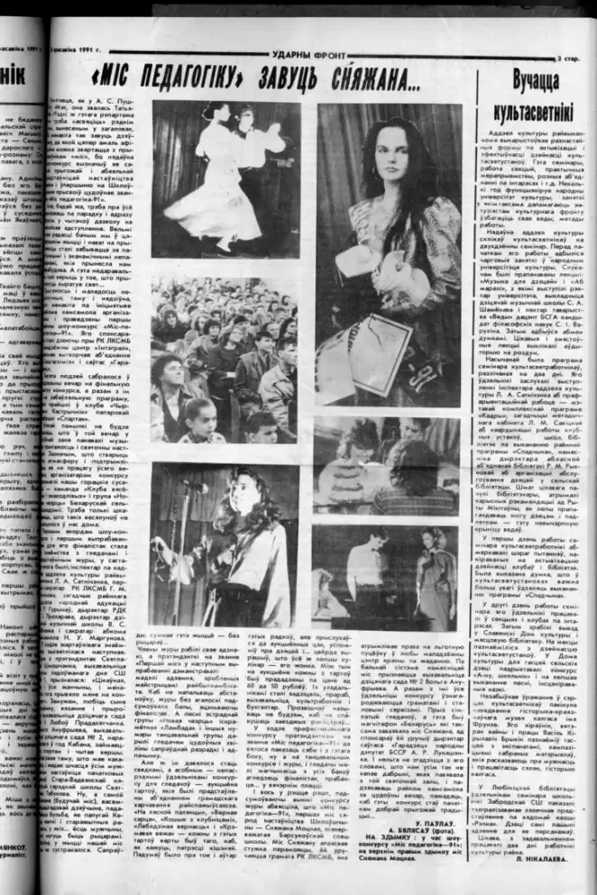 «…магнитофон «Беларусь», который также завоевала мисс Снежана, от спонсоров ей вручил директор совхоза «Городец», народный депутат БССР А.Г. Лукашенко».
