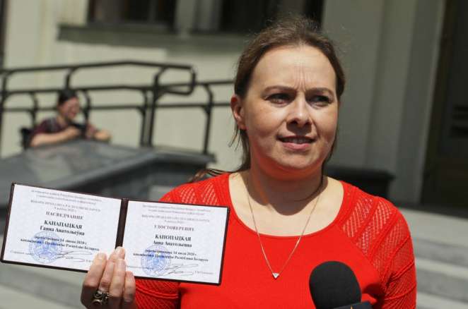 Снимок иллюстративного характера. Анна Канопацкая демонстрирует удостоверение кандидата в президенты после регистрации в качестве кандидата на президентских выборах в Минске, Беларусь. 14 июля 2020 года. Фото: Sergei Grits / AP Photo / East News