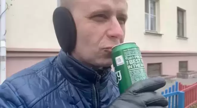 Максим Базыленко делает вид, что пьет пиво. Скриншот из видео