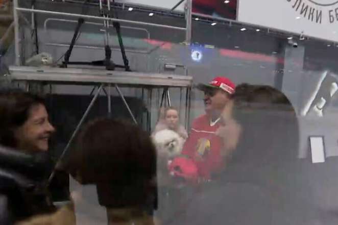 Светлана Коношенко держит шпица политика во время любительского хоккейного матча в Минске. 21 января 2023 года. Фото: пресс-служба политика