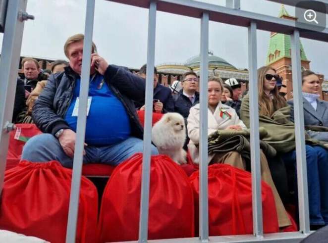 Бизнесмен Сергей Тетерин (слева), шпиц Умка и личный врач Александра Лукашенко Светлана Коношенко смотрят парад в честь Дня Победы. Москва, Россия, 9 мая 2024 года. Фото: life.ru