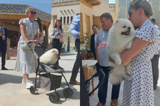 Светлана Коношенко со шпицем Умкой во время визита беларусской делегации в Узбекистан. Самарканд, сентябрь 2022 года. Фото: kun.uz