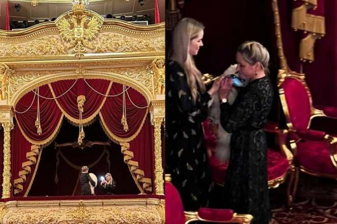Светлана Коношенко и шпиц Умка в Царской ложе в Большом театре в Москве 25 декабря 2022 года. Фото: телеграм-канал LEVItation