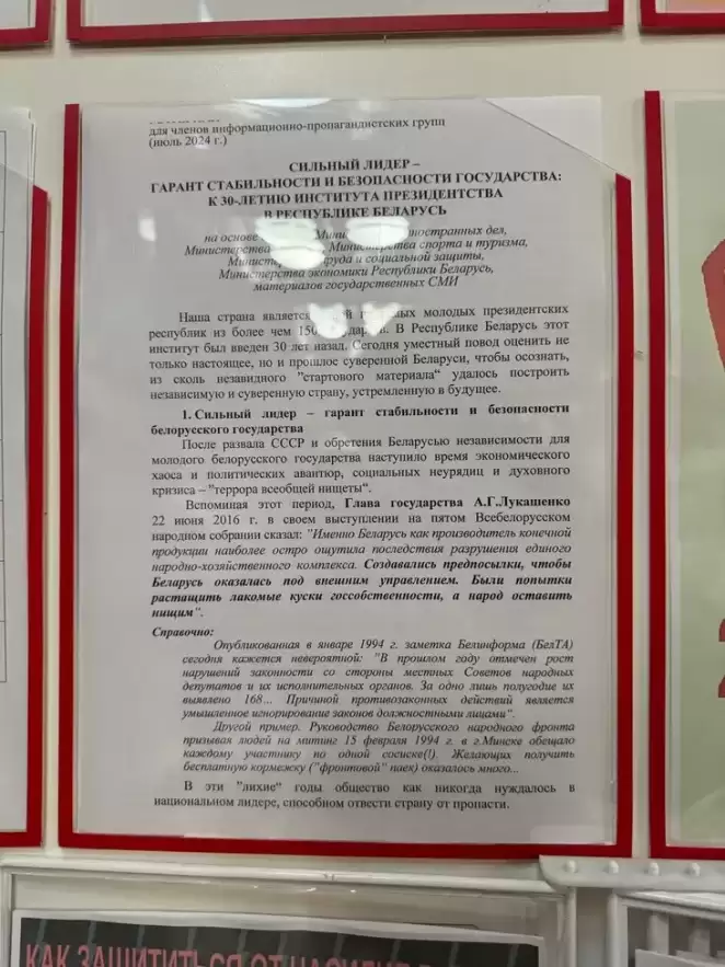 Белорусы заметили на стендах в некоторых госучреждениях страницы из методички для идеологов. Их авторы убеждают, «из сколь незавидного «стартового материала» удалось построить независимую и суверенную страну, устремленную в будущее», пишет «Салідарнасць».