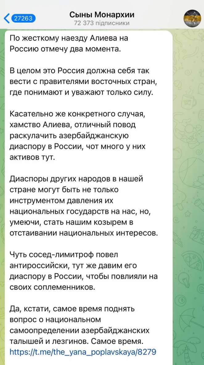 Российской пропагандой уже озвучиваются призывы к притеснению азербайджанской диаспоры в РФ. Так, российский пропагандист Роман Антоновский прямо призывает воспользоваться ситуацией с самолетом и «раскулачить» азербайджанскую диаспору, передает Dialog.UA cо ссылкой на заявление пропагандиста в соцсетях.