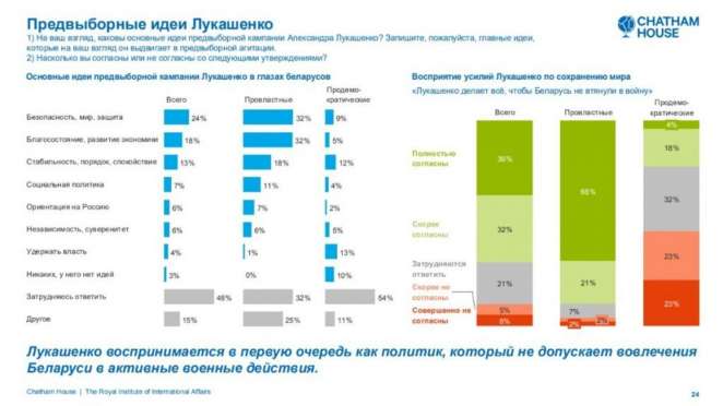 Основными предвыборными идеями Лукашенко опрошенные называли безопасность и мир (24% в целом, даже 9% продемократических), благосостояние и развитие экономики (18% в целом, 5% демократических), сохранение стабильности и порядка (13% в целом, 12% демократических). То, что основная идея Лукашенко – это сохранение власти, считает только 4% опрошенных и только 13% продемократических опрошенных, но вдруг и 1% провластных. Да 48% в целом и даже 32% опрошенных имели трудности с выбором ответа.