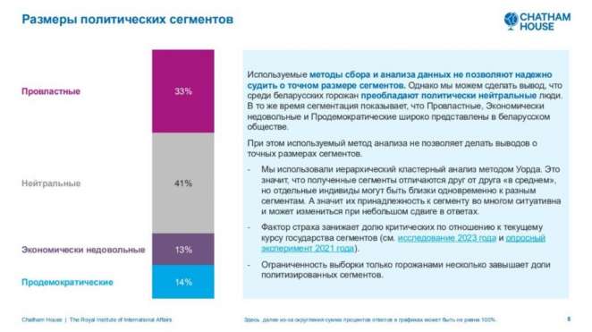 Исследователи оценили, что четко поддерживает Лукашенко 33%. Они, по словам Астапени, не обязательно согласны со всей политикой Лукашенко, но иногда не видят альтернативы. Еще 41% – нейтральные. 14% – четко продемократические, 13% – недовольны Лукашенко прежде всего по экономическим причинам.