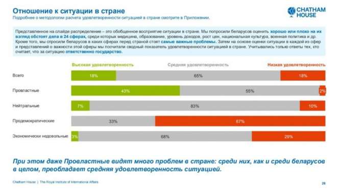 Большинство беларусов хотело бы, чтобы ситуация в Беларуси изменилась и чтобы началась «оттепель» (как то освобождение политзаключенных и улучшение отношений с Западом). Даже провластная группа это поддерживает, а противников «оттепели» в целом очень мало – не более 15%. В том, что «оттепель» будет, беларусы сомневаются: считают, что власти Беларуси в этом не заинтересованы, а Запад не готов взаимодействовать с автократом и союзником России.