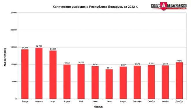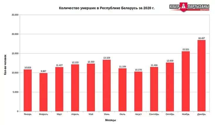По данным Минздрава, за весь период распространения инфекции (с марта 2020-го по июль 2022-го, более новых данных не публиковалось) умерли 7 тысяч 118 пациентов с выявленным COVID-19. Однако «Киберпартизаны» обнаружили, что коронавирусная инфекция как причина смерти в документах указана в 22 759 случаях — то есть более чем в три раза больше, чем в официально объявленном властями числе жертв ковида.