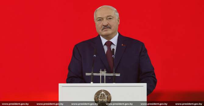 Символично, что свою речь Лукашенко произнес на кроваво-красном фоне. Фото: president.gov.by