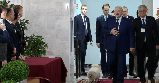 Лукашенко в сопровождении свиты и шпица Умки входит на избирательный участок в Минске 26 января 2025 года