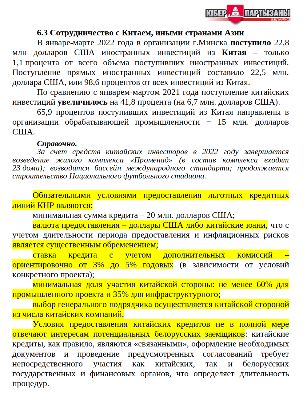 Отдельный раздел в документе посвящен сотрудничеству с Китаем. В нем отмечается, что китайская сторона навязывает белорусским партнерам крайне невыгодные условия в обмен на инвестиции со своей стороны.