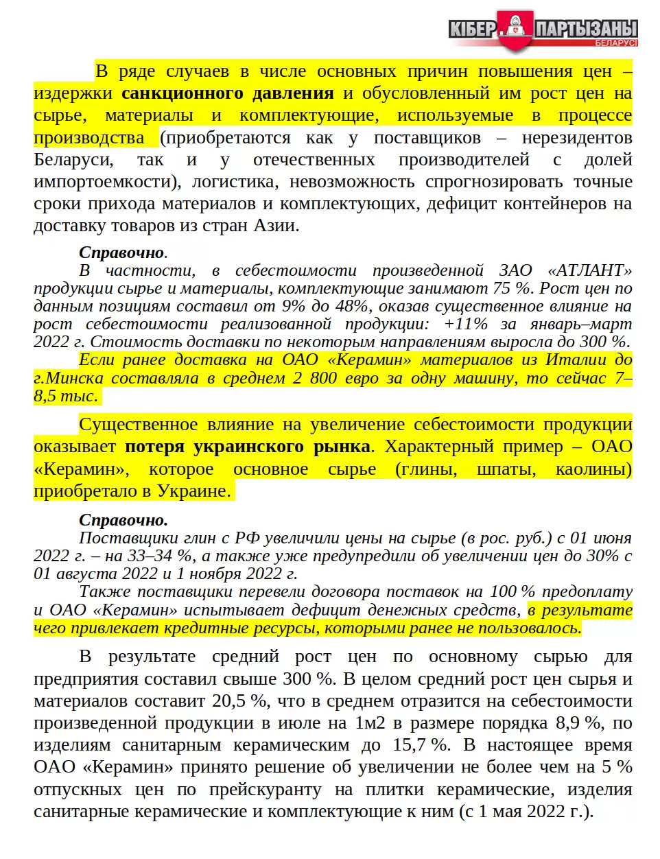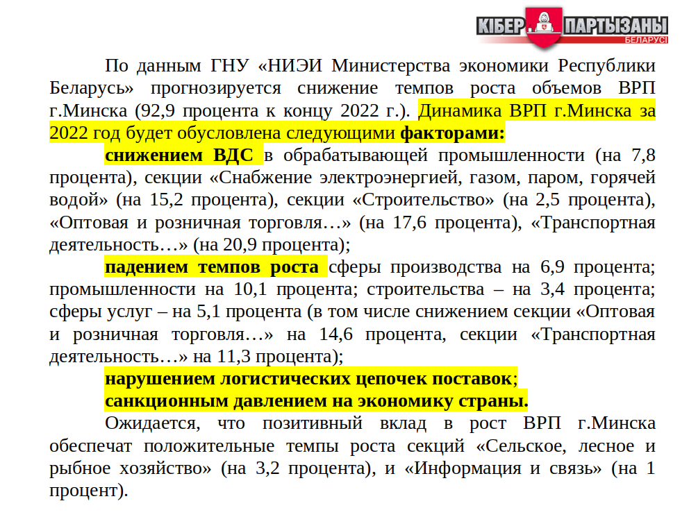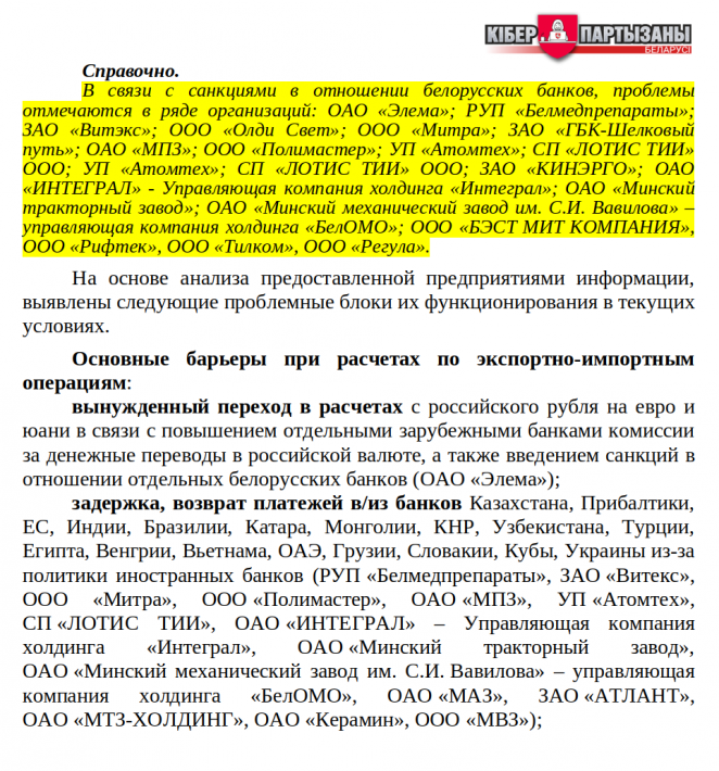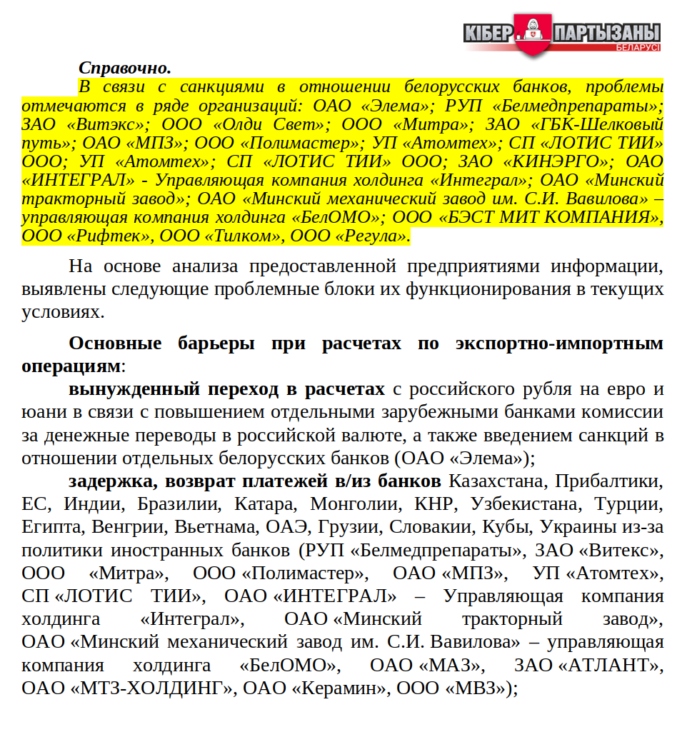 Кроме того, в документе подробно описывают, как именно санкции и потеря украинского рынка сказались на ведущих предприятиях города Минска: