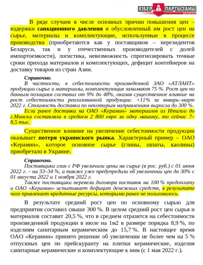 Документ составлен в июне 2022 г. В нем также подробно расписано, как санкции ЕС и США повлияли на экономику и какими путями некоторые прикорытные компании РБ пытаются их обходить.