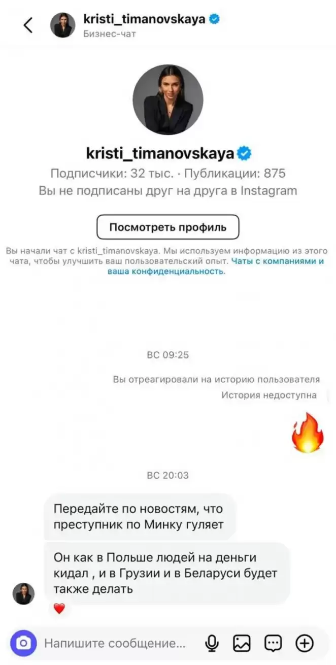 «Наша Ніва» также попросила легкоатлетку прокомментировать переписку с Игорем Туром. Пропагандист вчера выложил в своем телеграм-канале скриншот, на котором он якобы отреагировал на сторис Кристины огоньком, а она написала ему: «Передайте по новостям, что преступник по Минску гуляет. Он как в Польше людей на деньги кидал, и в Грузии, и в Беларуси будет так же делать».