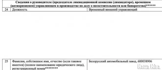 Имя физического лица — управляющего не указано. Это значит, что формальный новый директор ещё не назначен, а роль руководителя исполняет юридическое лицо «Белорусского автомобильного завода». Это жодинский БелАЗ, к структуре которого, как следует, присоединили холдинг «Амкодор».