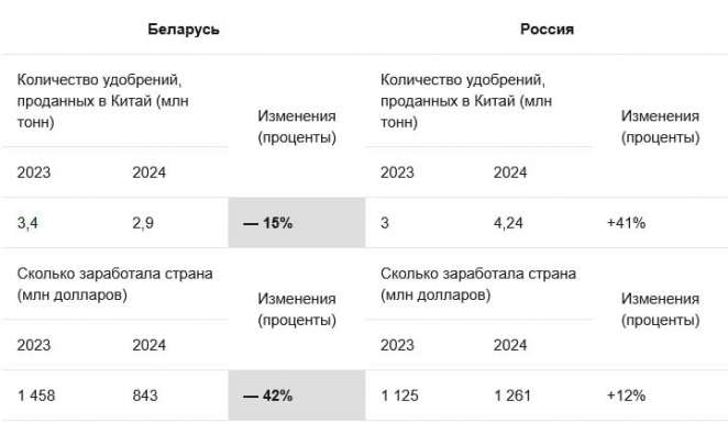 В результате получилось так, что Беларусь за 2024 год поставила на 15% меньше удобрений, чем в 2023 году. А доходы белорусской стороны буквально рухнули: согласно данным китайской таможни, наша страна получила от Китая всего 843 миллиона долларов в 2024-м. Это на 42% меньше, чем годом ранее.