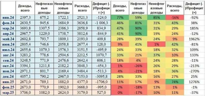 В марте нефтяные доходы упали на (-17%), ненефтяные выросли на 10%. В итоге общая сумма доходов выросла на 0%.