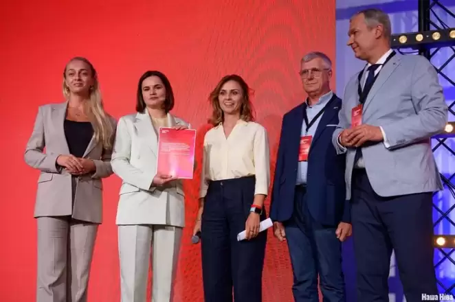 Анжелика Мельникова, Светлана Тихановская, Елена Живоглод, Александр Добровольский и Павел Латушко на конференции «Новая Беларусь» 3 августа 2024 года