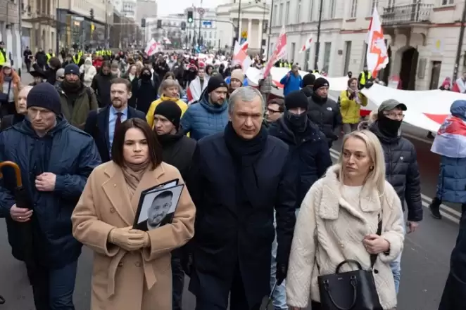 Светлана Тихановская, Павел Латушко и Анжелика Мельникова в Варшаве на шествии протеста против фальсификации выборов в Беларуси, 26 января 2025 года. Фото: Vasily Krestyaninov SOPA Images LightRocket via Getty Images
