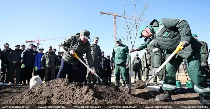 «Первое дерево на месте парка Народного единства посадил лично президент. А заодно провел мастер-класс по посадке деревьев. Александр Лукашенко заметил, что люди, которые работают вместе с ним, умеют делать все: сажать деревья, косить траву, рубить дрова.