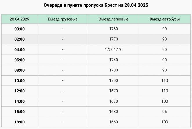 Очереди в пункте пропуска «Брест» (единственном на белорусско-польской границе) начали расти с минувшего вторника, 21 апреля. Если утром выезда в Польшу ожидали 67 автомобилей, то уже к середине 22 апреля их количество перевалило за 1000. Дальше — больше. В четверг, 24 апреля, количество легковых авто, ожидающих выезда, превысило 1500, а к ночи пятницы, 25 апреля, доросло до 1730.