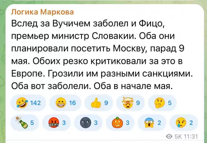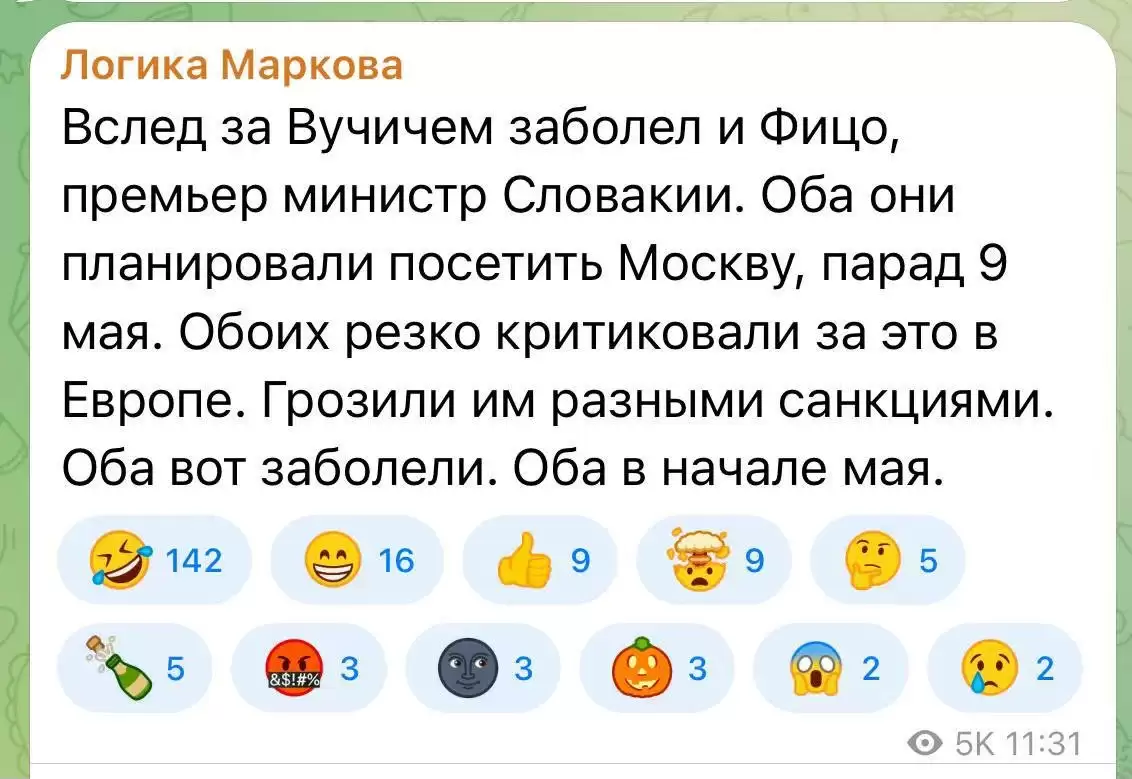 — После проблем со здоровьем, которые на фоне недуга Александра Вучича теперь возникли и у «словацкого оригинала» Роберта Фицо, кошки на душе скребут по поводу Виктора Орбана, — иронизирует политический обозреватель Александр Фридман. — Хуже всего, однако, Александру Лукашенко. Помешать ему приехать в Москву на 9 мая в нынешней ситуации может, пожалуй, лишь вторжение инопланетян в Могилевскую область.