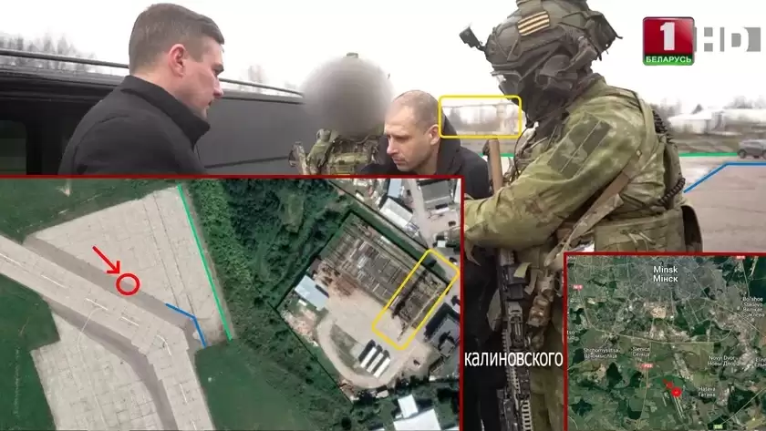 Вертолет сел в северо-восточной части военного аэродрома Мачулищи под Минском. На точное место указывают ориентиры: большой желтый рельсовый кран в промзоне рядом с аэродромом, раскладка бетонных авиационных плит и другие.