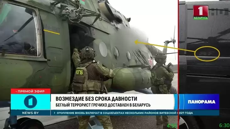 КГБ специально не показывает бортовой номер вертолета, на котором перевозили Гречихо. Во всех кадрах с вертолетом он заблюрен. Однако этот номер на мгновение возникает в отражении автомобильного стекла в конце сюжета.