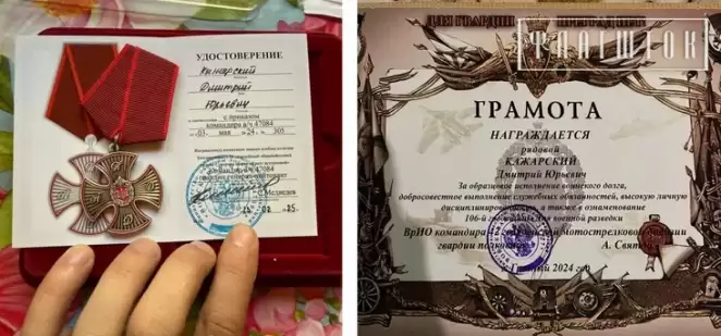 Дмитрий опубликовал фото удостоверения боевой награды «Крест штурмовой» по приказу командира в/ч 47084 от мая 2024 года (соответствующее удостоверение выдано 23 февраля 2025 года) и грамоты «за образцовое выполнение служебных обязанностей» от ВрИО командира 42-й гвардейской мотострелковой дивизии, расположенной в Грозном, — тоже в 2024 году.