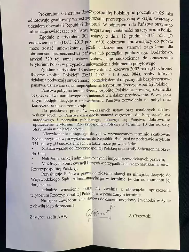 Сообщается, что в связи с тем, что пребывание получателя письма на территории Польши представляет угрозу национальной безопасности страны, было принято решение аннулировать вид на жительство. От получателя требуется добровольно покинуть территорию Польши в течение 10 дней.