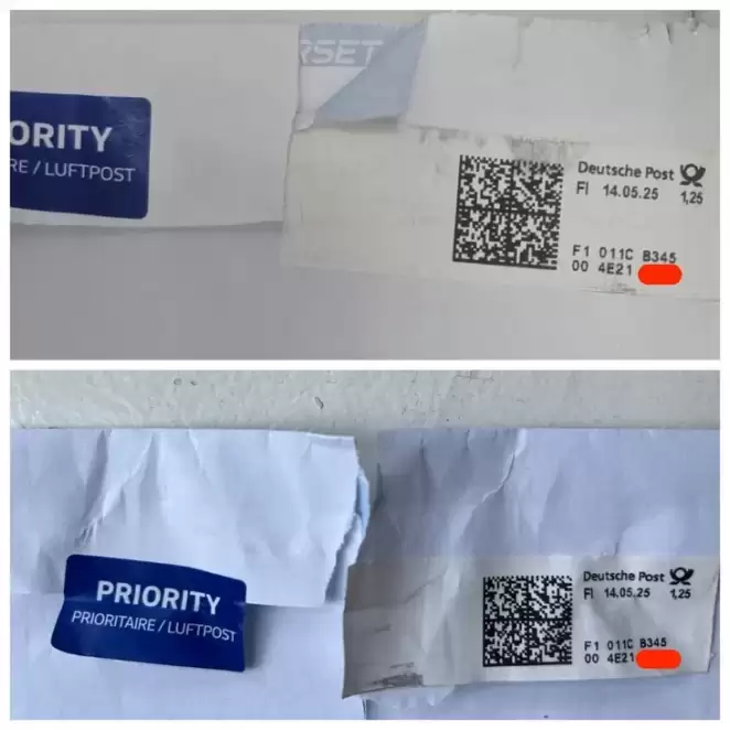 В обоих случаях письма имеют абсолютно одинаковое содержание и не содержат никаких личных данных получателя. Конверты были отправлены с территории Германии. В обоих случаях дата отправки — 14 мая 2025 года.