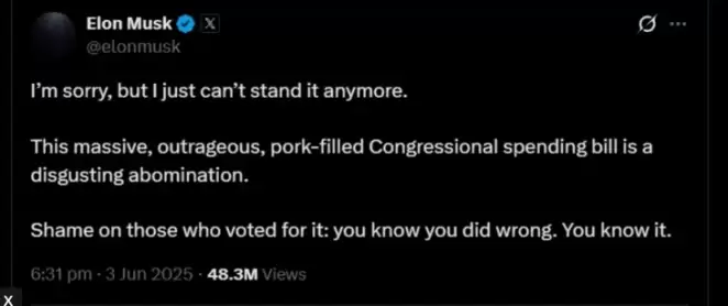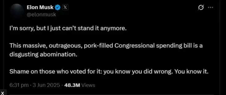 «Простите, но я больше не могу терпеть. Этот огромный, возмутительный, полный «свинины» билль о расходах — это отвратительная мерзость. Позор тем, кто голосовал за него: вы знаете, что поступили плохо», — написал Илон Маск в своей соцсети X.