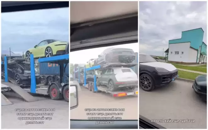 Далее можно увидеть автовоз с шестью машинами, по меньшей мере пять из которых — это Porsche различных моделей.