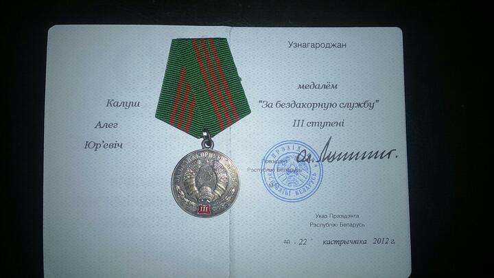 Медаль «За безупречную службу» и свидетельство к ней, которые Олег Калуш вернул в МВД в августе 2020-го. Фото: личный архив
