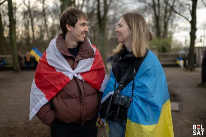 Беларус и украинка, оказавшиеся в Германии после начала войны в Украине на акции солидарности у Бранденбургских ворот в Берлине по случаю второй годовщины российского вторжения. Берлин, Германия. 24 февраля 2024 года. Фото: Карина Пашко / Белсат