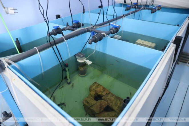 Мини-бассейны с креветками в отремонтированном здании бывшей школы, созданные предпринимателем из Барановичей Владимиром Готовчицем в Ляховичском районе, Беларусь. Апрель 2025 года. Фото: БелТА