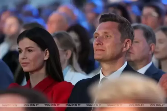 После своего выступления Лукашенко сел в зале. По правую руку от 70-летнего политика расположился его младший сын Николай, по левую — 27-летняя Владлена Зайцева.
