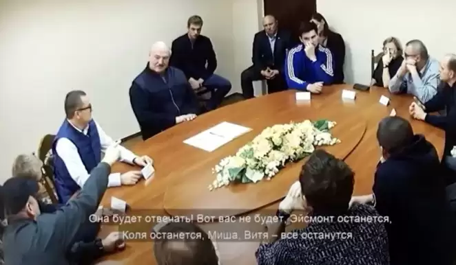 Во время встречи Александра Лукашенко с политзаключенными 10 октября 2020 года. Скриншот с видео: Сергей Тихановский показывает пальцем в направлении Коли и Натальи Эйсмонт