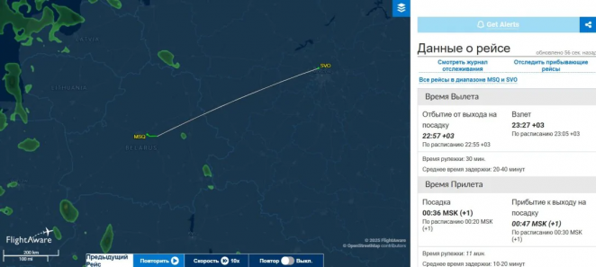 На портал flightaware есть информация о рейсе AFL1845 «Аэрофлота». Указывается, что самолет вылетел из Минска в 23:27 (по минскому времени) 10 июля и приземлился в Москве в 00:36. Также есть карта полёта, на которой не заметно ничего необычного.
