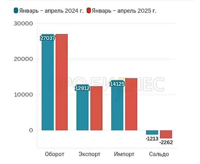 Он привел статистику внешней торговли Беларуси за январь-апрель 2024 и этот же период 2025 года. По ней видно, что отрицательно торговое сальдо выросло почти в два раза.